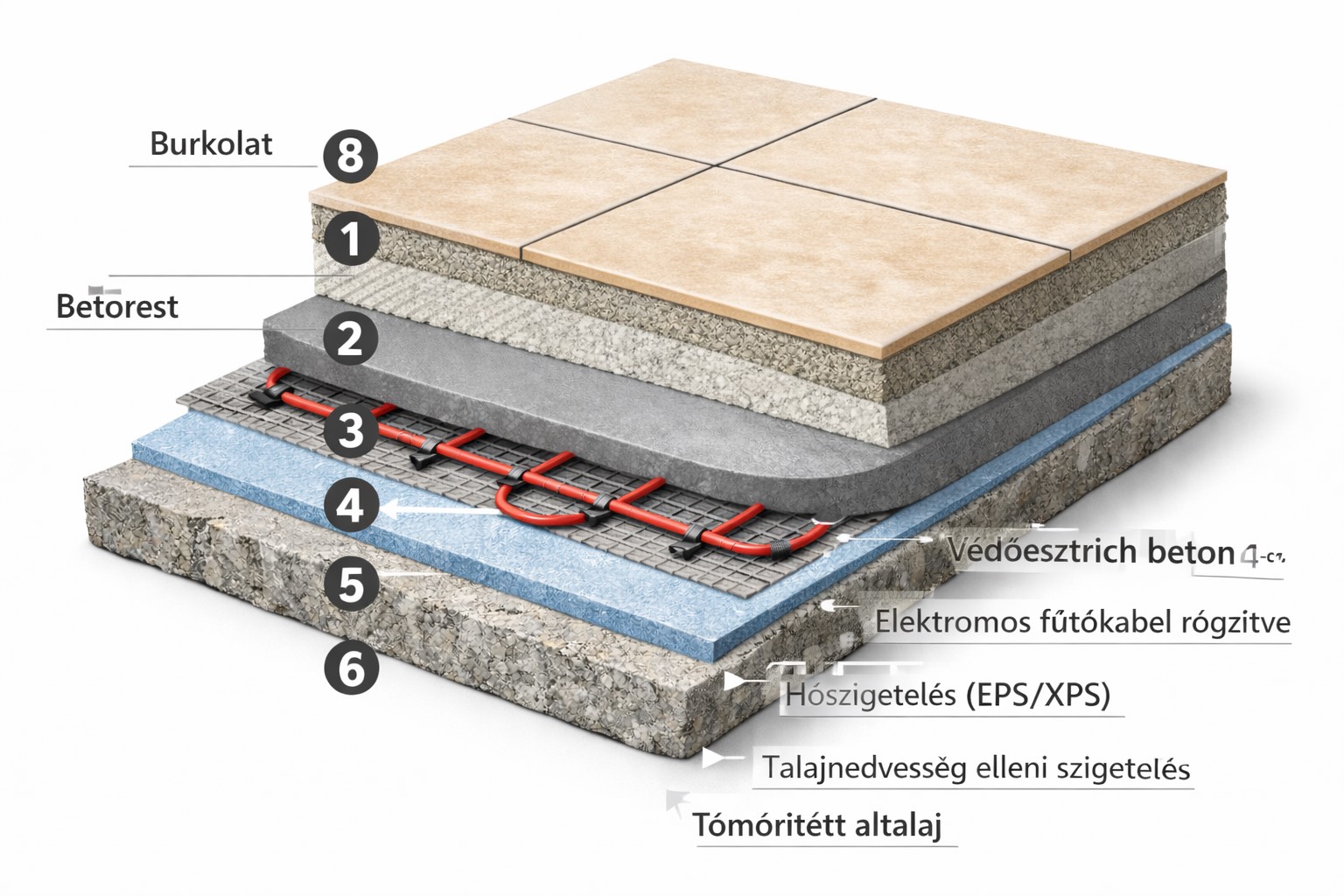 Az elektromos fűtőkábel beton (esztrich) alá történő beépítése az egyik legmegbízhatóbb és legtartósabb megoldás elektromos padlófűtés kialakítására. A megfelelő rétegrend és szakszerű kivitelezés biztosítja az egyenletes hőeloszlást, az energiahatékony működést és a hosszú élettartamot.